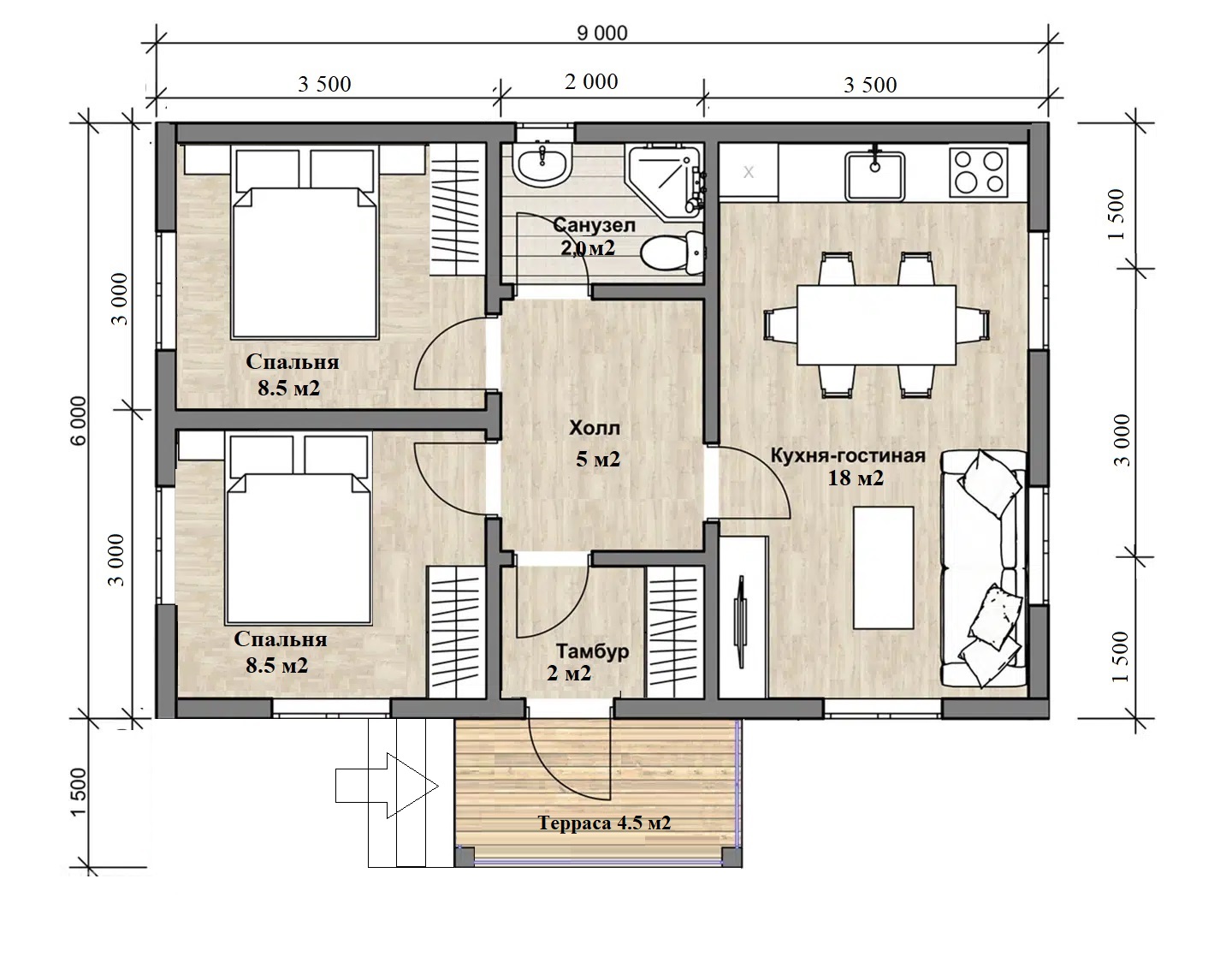 | Габариты | 8х9 | Площадь дома, м² | 68 |